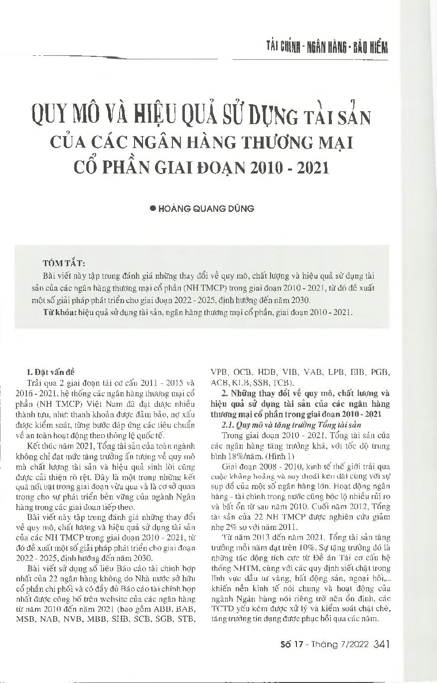 Quy mô và hiệu quả sử dụng tài sản của các ngân hàng thương mại cổ phần giai đoạn 2010 - 2021 = Scale and efficiency of asset utilization of commercial joint stock banks from 2010 to 2021