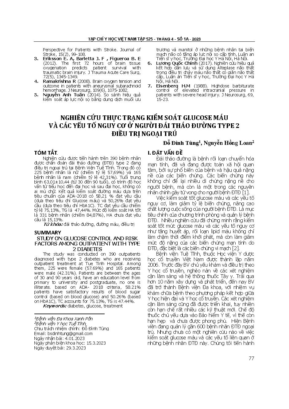 Nghiên cứu thực trạng kiểm soát glucose máu và các yếu tố nguy cơ ở người đái tháo đường type 2 điều trị ngoại trú = Study on glucose control and risk factors among outpatient with type 2 diabetes