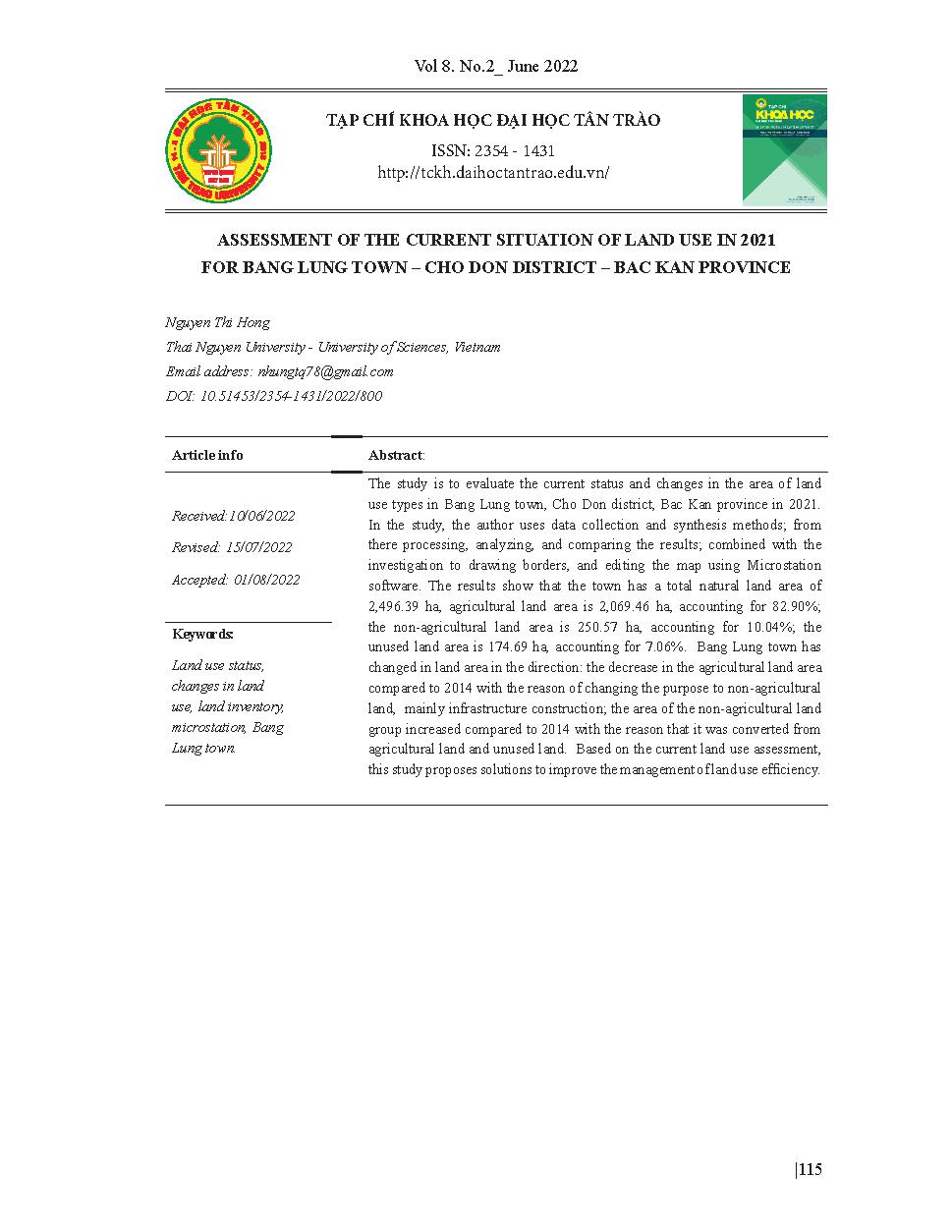 Đánh giá hiện trạng sử dụng đất năm 2021 thị trấn Bằng Lũng - huyện Chợ Đồn - tỉnh Bắc Kạn = Assessment of the current situation of land use in 2021 for Bang Lung town – Cho Don district – Bac Kan province