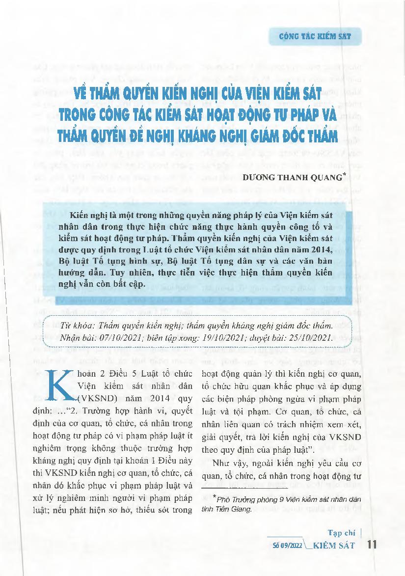 Về thẩm quyền kiến nghị của Viện kiểm sát trong công tác kiểm sát hoạt động tư pháp và thẩm quyền đề nghị kháng nghị giám đốc thẩm