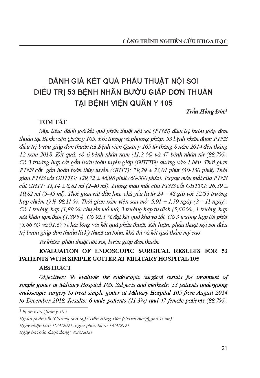 Đánh giá kết quả phẫu thuật nội soi điều trị 53 bệnh nhân bướu giáp đơn thuần tại Bệnh viện Quân y 105