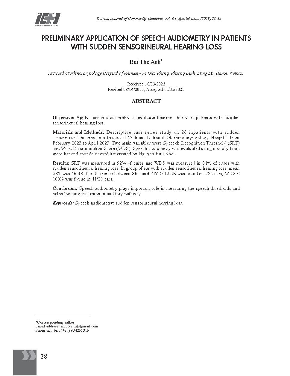 Đo thính lực lời và bước đầu ứng dụng đánh giá sức nghe ở người bệnh nghe kém đột ngột = Preliminary application of speech audiometry in patients with sudden sensorineural hearing loss