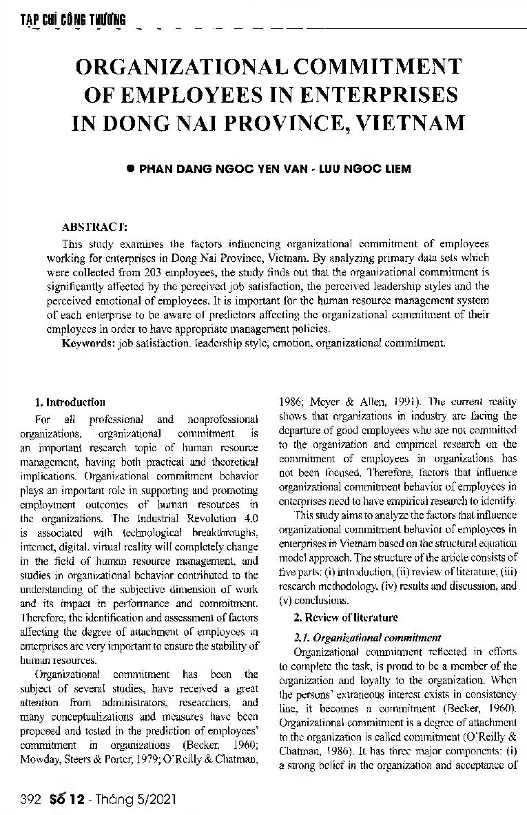 Sự gắn kết tổ chức của người lao động trong các doanh nghiệp tại tỉnh Đồng Nai = Organizational commitment of employees in enterprises in Dong Nai Province, Vietnam
