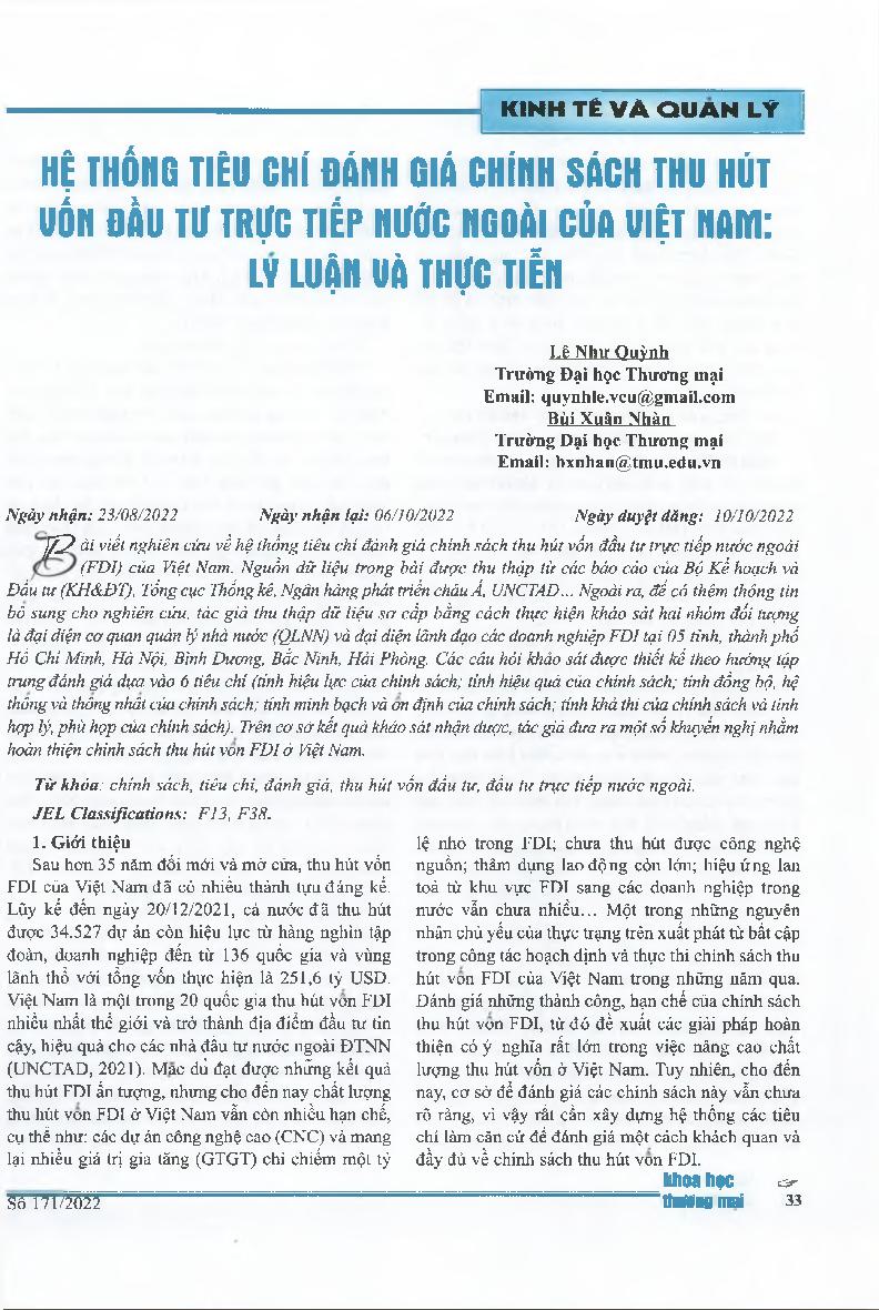 Hệ thống tiêu chí đánh giá chính sách thu hút vốn đầu tư trực tiếp nước ngoài của Việt Nam: lý luận và thực tiễn = Criteria system for evaluating policies to attract foreign direct investment in Vietnam: Theory and practice