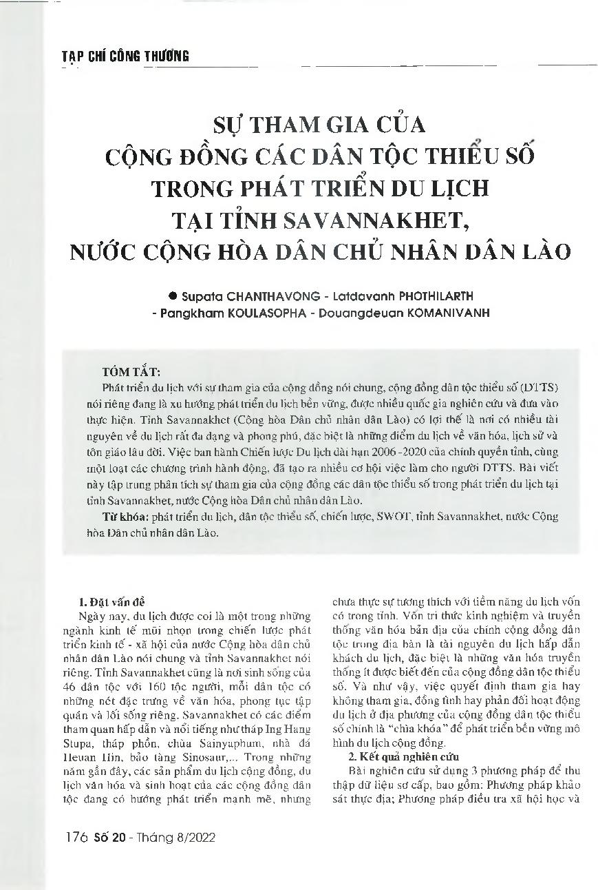 Sự tham gia của cộng đồng các dân tộc thiểu số trong phát triển du lịch tại tỉnh Savannakhet, nước Cộng hòa dân chủ nhân dân Lào = The participation of ethnic minorities in the tourism development in Savannakhet province, Laos