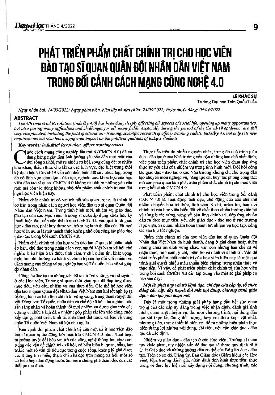Phát triển phẩm chất chính trị cho học viên đào tạo sĩ quan quân đội nhân dân Việt Nam trong bôi cảnh cách mạng công nghệ 4.0 = Developing political qualities for officer cadets of the Vietnamese People’s Army in the context of the 4th Industrial Revoluti