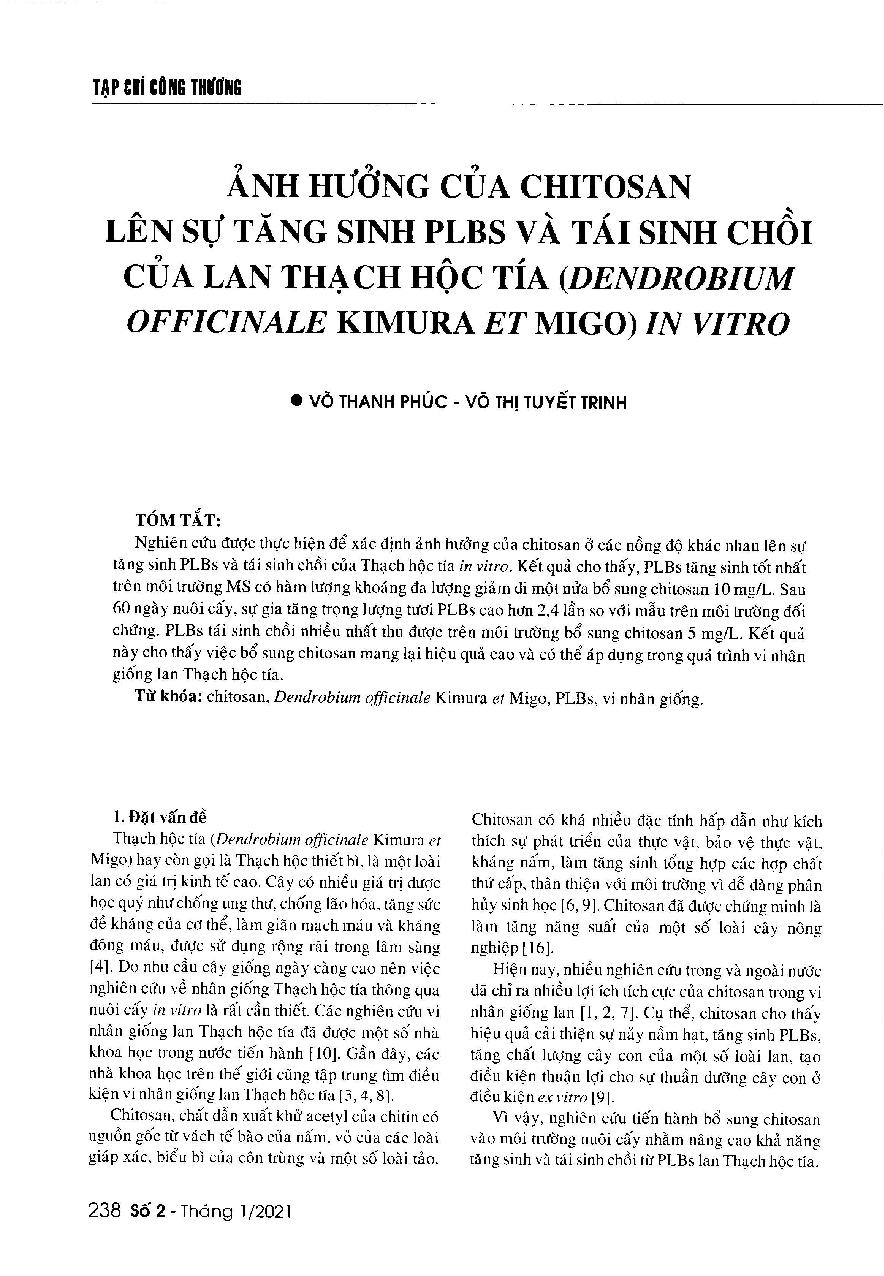 Ảnh hưởng của chitosan lên sự tăng sinh PLBS và tái sinh chồi của lan Thạch hộc tía (Dendrobium officinale Kimura et Migo) in vitro = Effects of Chitosan on PLBs proliferation and shoot regeneration of Dendrobium Officinale Kimura et Migo in vitro
