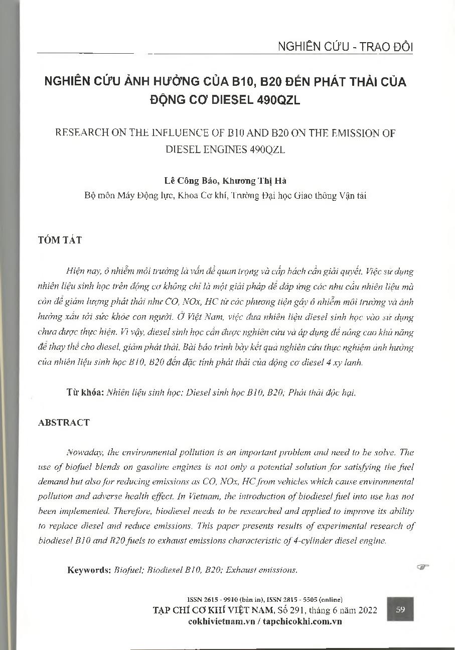 Nghiên cứu ảnh hưởng của B10, B20 đến phát thải của động cơ diesel 490QZL = Research on the influence of bio and b20 on the emission of diesel engines 490qzl
