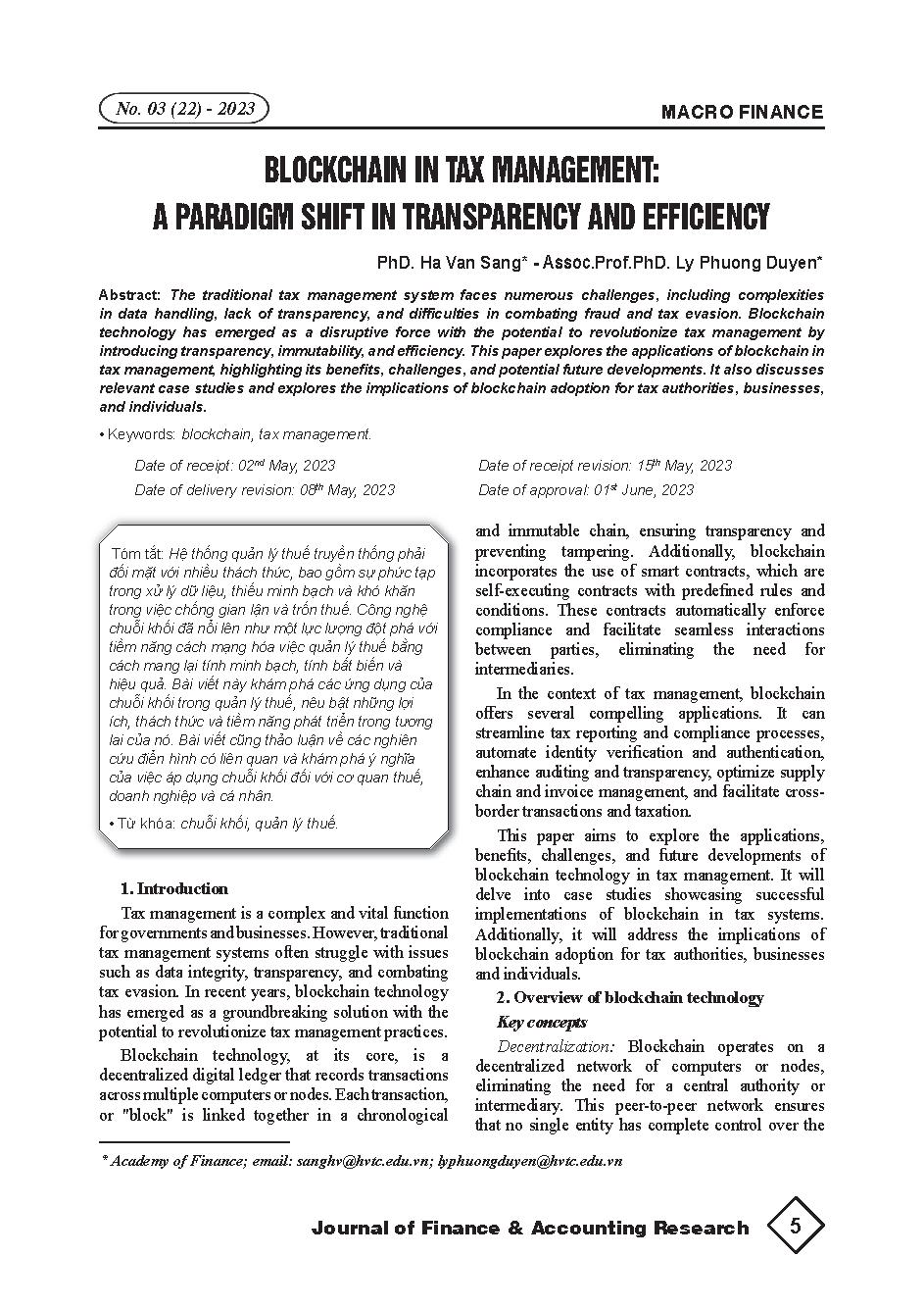 Chuỗi khối trong quản lý thuế: Sự thay đổi mô hình về tính minh bạch và hiệu quả = Blockchain in tax management: A paradigm shift in transparency and efficiency