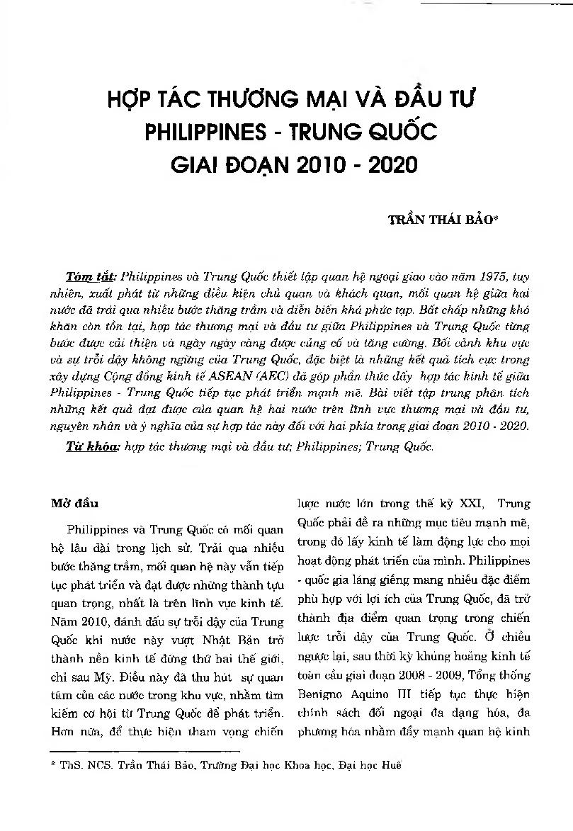 Hợp tác thương mại và đầu tư Philippines - Trung Quốc giai đoạn 2010 - 2020 = Trade and Investment Cooperation between the Philippines and China in the Period of 2010 - 2020