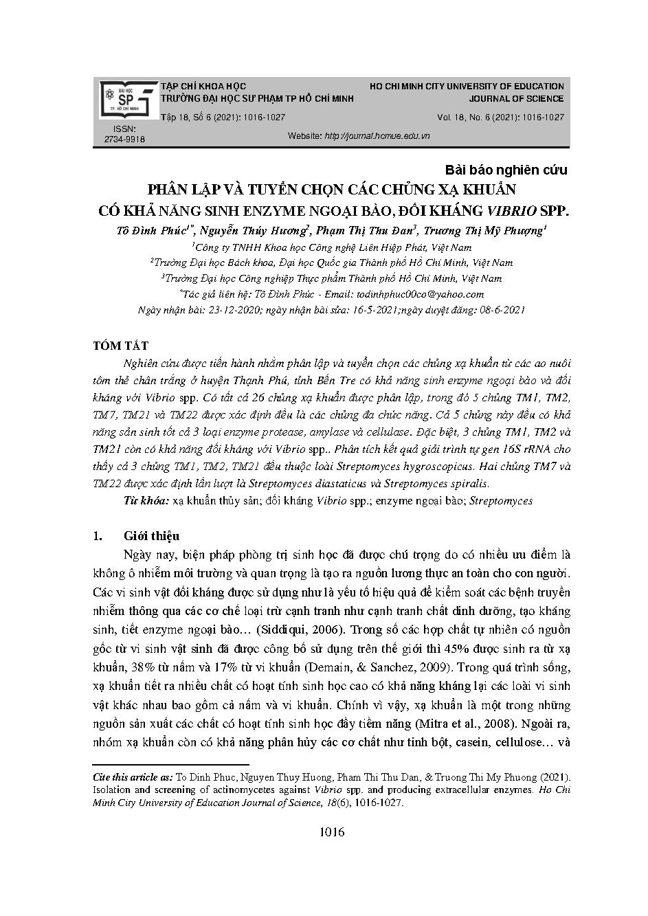 Phân lập và tuyển chọn các chủng xạ khuẩn có khả năng sinh enzyme ngoại bào, đối kháng vibrio spp. = Isolation and screening of actinomycetes against vibrio spp. and producing extracellular enzymes