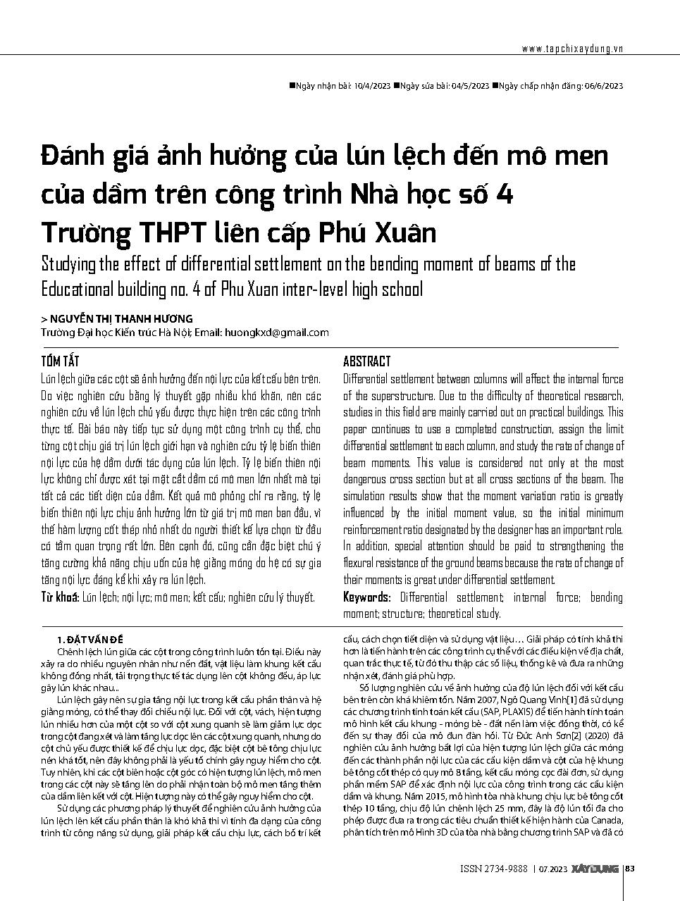 Đánh giá ảnh hưởng của lún lệch đến mô men của dầm trên công trình Nhà học số 4 Trường THPT liên cấp Phú Xuân = Studying the effect of differential settlement on the bending moment of beams of the Educational building no. 4 of Phu Xuan inter-level high sc