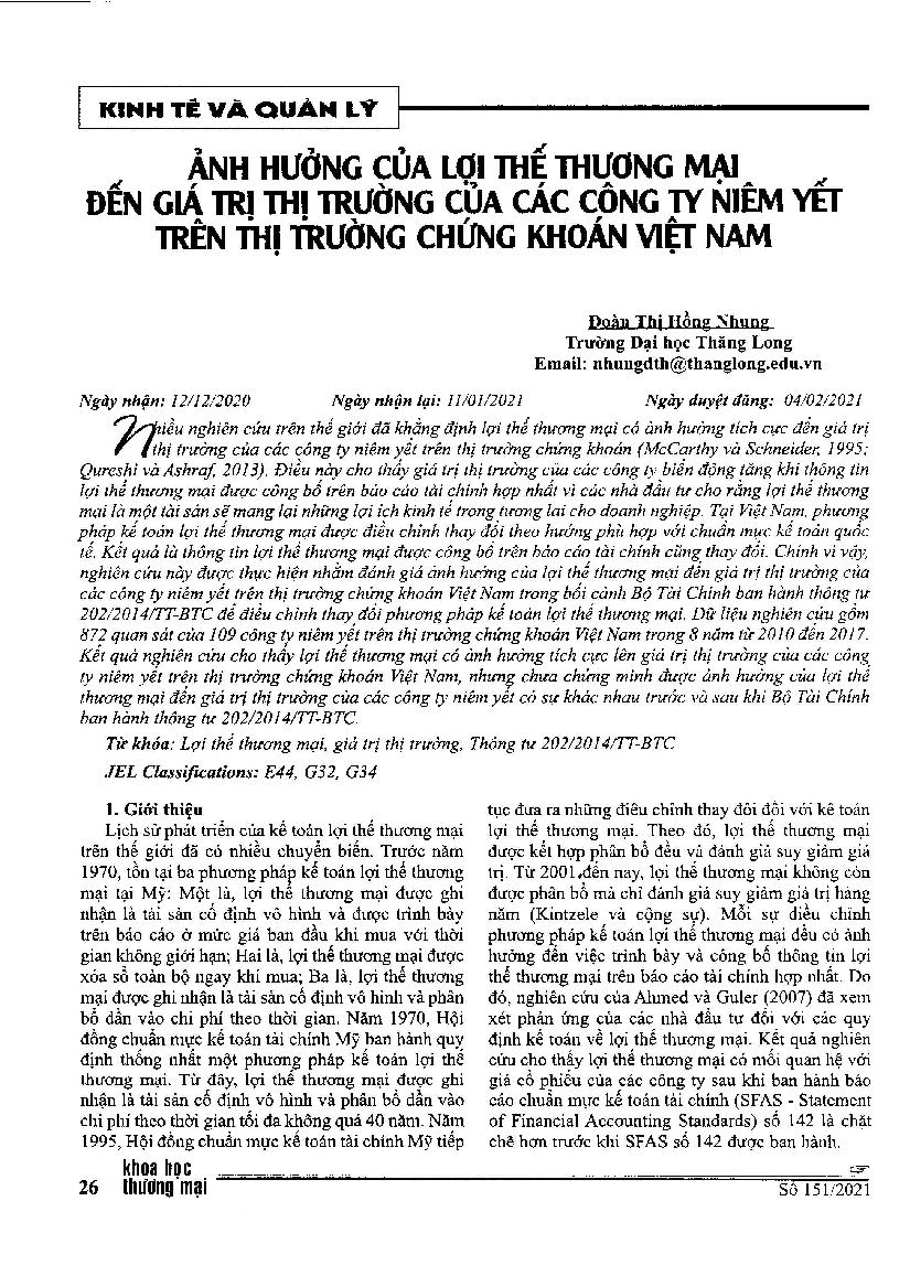Ảnh hưởng của lợi thế thương mại đến giá trị thị trường của các công ty niêm yết trên thị trường chứng khoán Việt Nam market = Studying the effect of goodwill on the market value of companies listed on Vietnam's stock