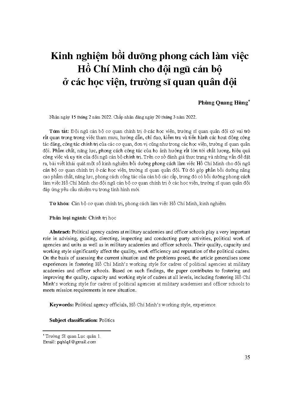 Kinh nghiệm bồi dưỡng phong cách làm việc Hồ Chí Minh cho đội ngũ cán bộ ở các học viện, trường sĩ quan quân đội = Experiences in development of Hồ Chí Minh’s working style for cadres in military academies and officers’ training Institutions