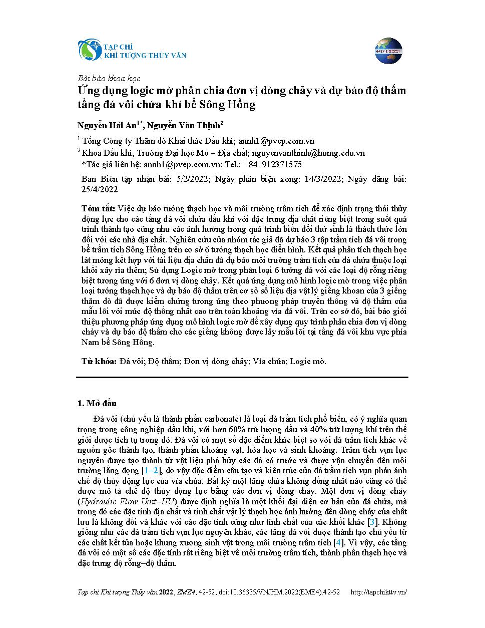 Ứng dụng logic mờ phân chia đơn vị dòng chảy và dự báo độ thấm tầng đá vôi chứa khí bể Sông Hồng = Fuzzy logic driven model applied to classify hydraulic flow unit and to predict permeability of carbonate reservoirs in Song–Hong basin