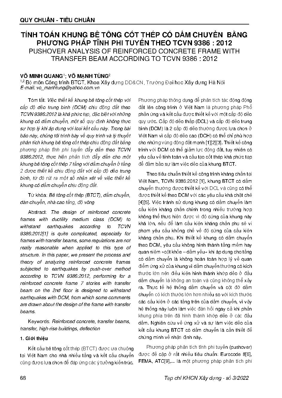 Tính toán khung bê tông cốt thép có dầm chuyển bằng phương pháp tĩnh phi tuyến theo tcvn 9386 : 201 = Pushover analysis of reinforced concrete frame with transfer beam according to tcvn 9386 : 2012
