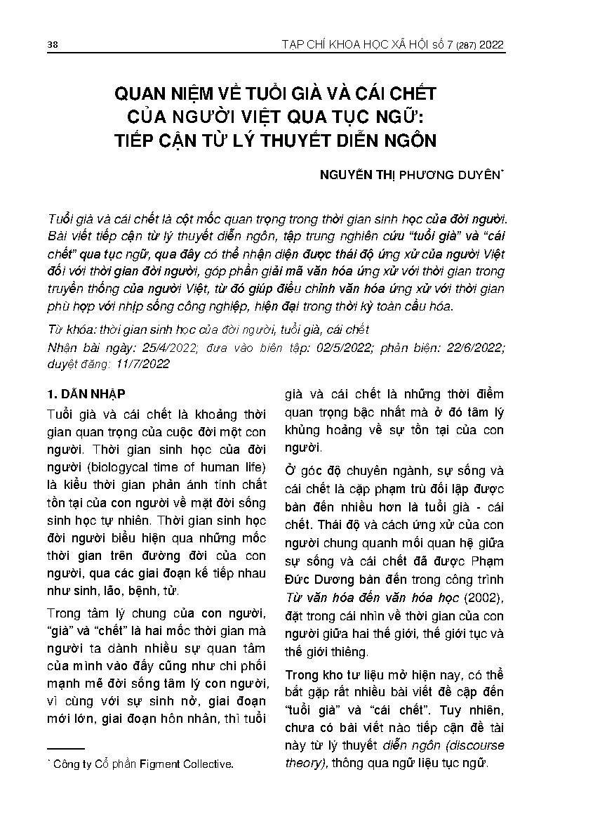 Quan niệm về tuổi già và cái chết của người Việt qua tục ngữ: tiếp cận từ lý thuyết diễn ngôn = Concept about the old age and death of the Vietnamese people through the proverbs: Approach from discourse theory