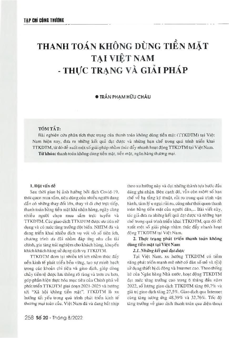 Thanh toán không dùng tiền mặt tại Việt Nam - Thực trạng và giải pháp = Non-cash payments in Vietnam: Current situation and solutions