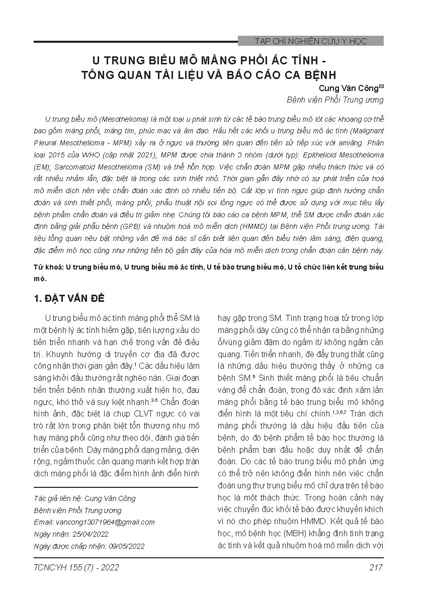 U trung biểu mô màng phổi ác tính - Tổng quan tài liệu và báo cáo ca bệnh = Malignant pleural mesothelioma - a literature review and case report