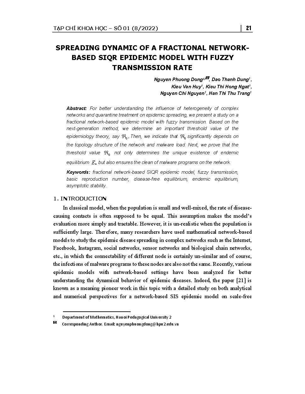 Động lực lan truyền của mô hình dịch SIQR phân thứ dựa trên mạng với lan truyền mờ = Spreading dynamic of a fractional network based siqr epidemic model with fuzzy transmission rate