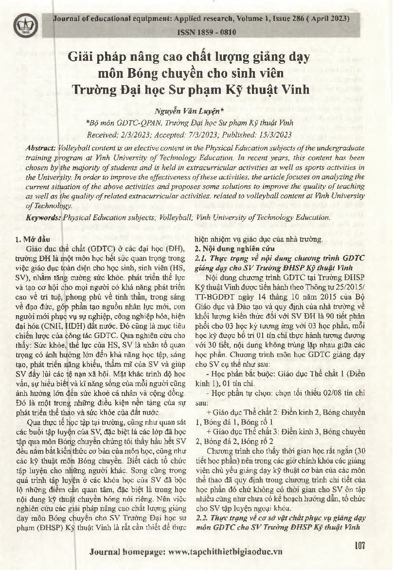 Giải pháp nâng cao chất lượng giảng dạy môn Bóng chuyền cho sinh viên Trường Đại học Sư phạm Kỹ thuật Vinh = Some solutions to enhance the quality of teaching volleyball for students at Vinh University of Technology Education.