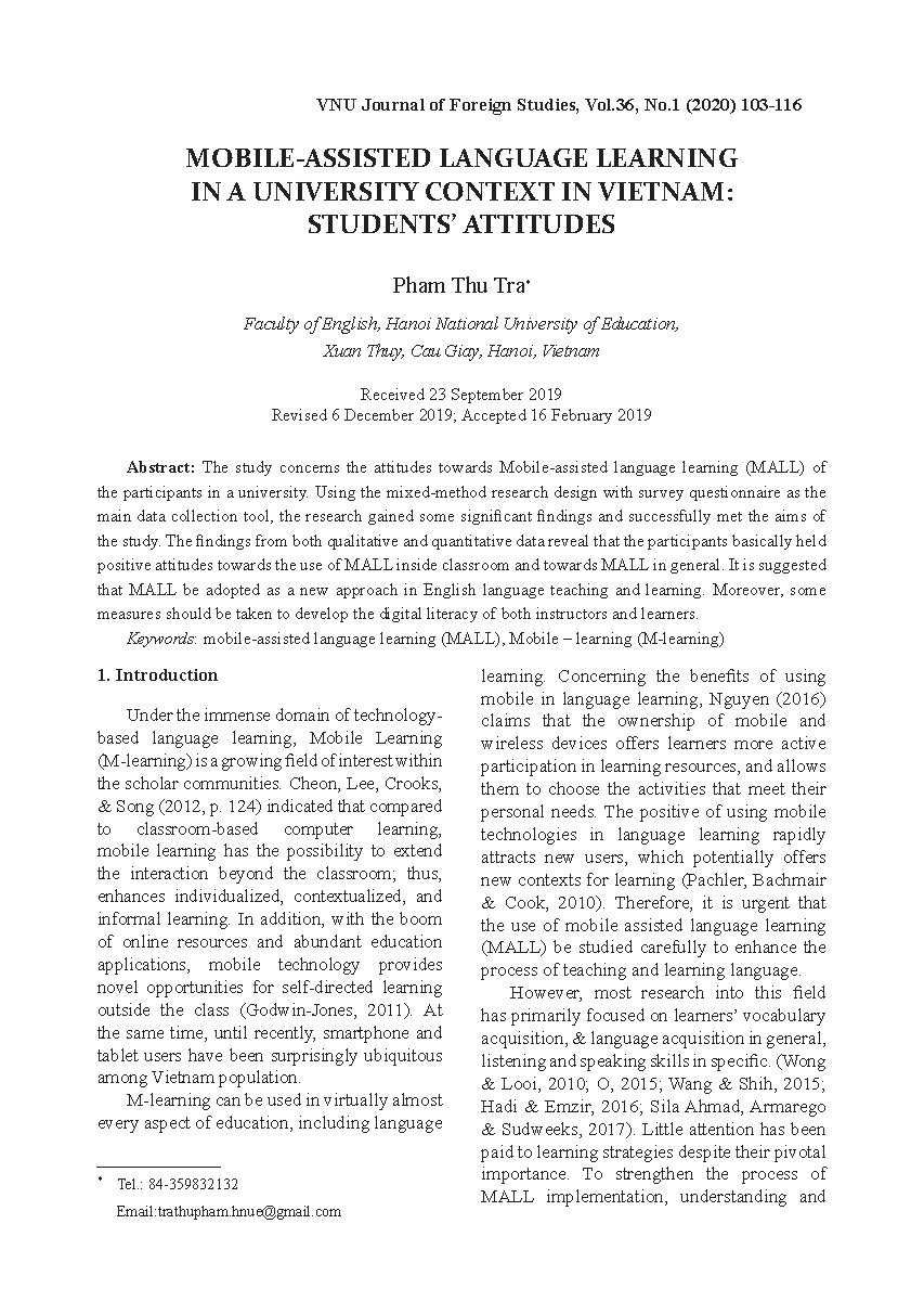 HỌC NGỌAI NGỮ VỚI SỰ HỖ TRỢ CỦA THIẾT BỊ DI ĐỘNG TẠI MỘT TRƯỜNG ĐẠI HỌC TẠI VIỆT NAM: THÁI ĐỘ CỦA SINH VIÊN = MOBILE-ASSISTED LANGUAGE LEARNING IN A UNIVERSITY CONTEXT IN VIETNAM: STUDENTS’ ATTITUDES