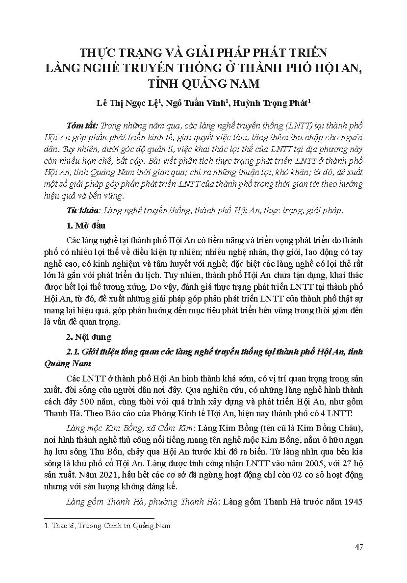 Thực trạng và giải pháp phát triển làng nghề truyền thống ở thành phố Hội An, tỉnh Quảng Nam = The situation and solutions to development of traditional trade villages in Hoi An city, Quang Nam province