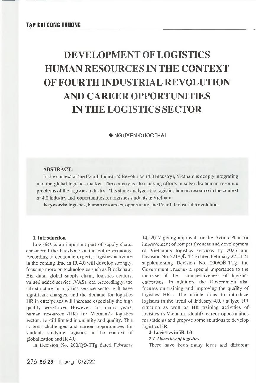 Phát triển nhân lực ngành logistics trong thời kỳ Công nghiệp 4.0 - cơ hội nghề nghiệp trong ngành Logistics = Development of logistics human resources in the context of Fourth Industrial Revolution and career opportunities in the logistics sector