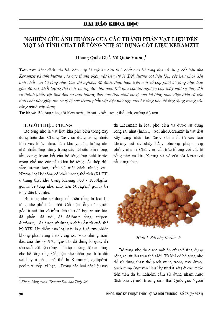 Nghiên cứu ảnh hưởng của các thành phần vật liệu đến một số tính chất bê tông nhẹ sử dụng cốt liệu Keramzit = Study on the effects of mix design on the lightweight concrete properties using keramzit aggregate