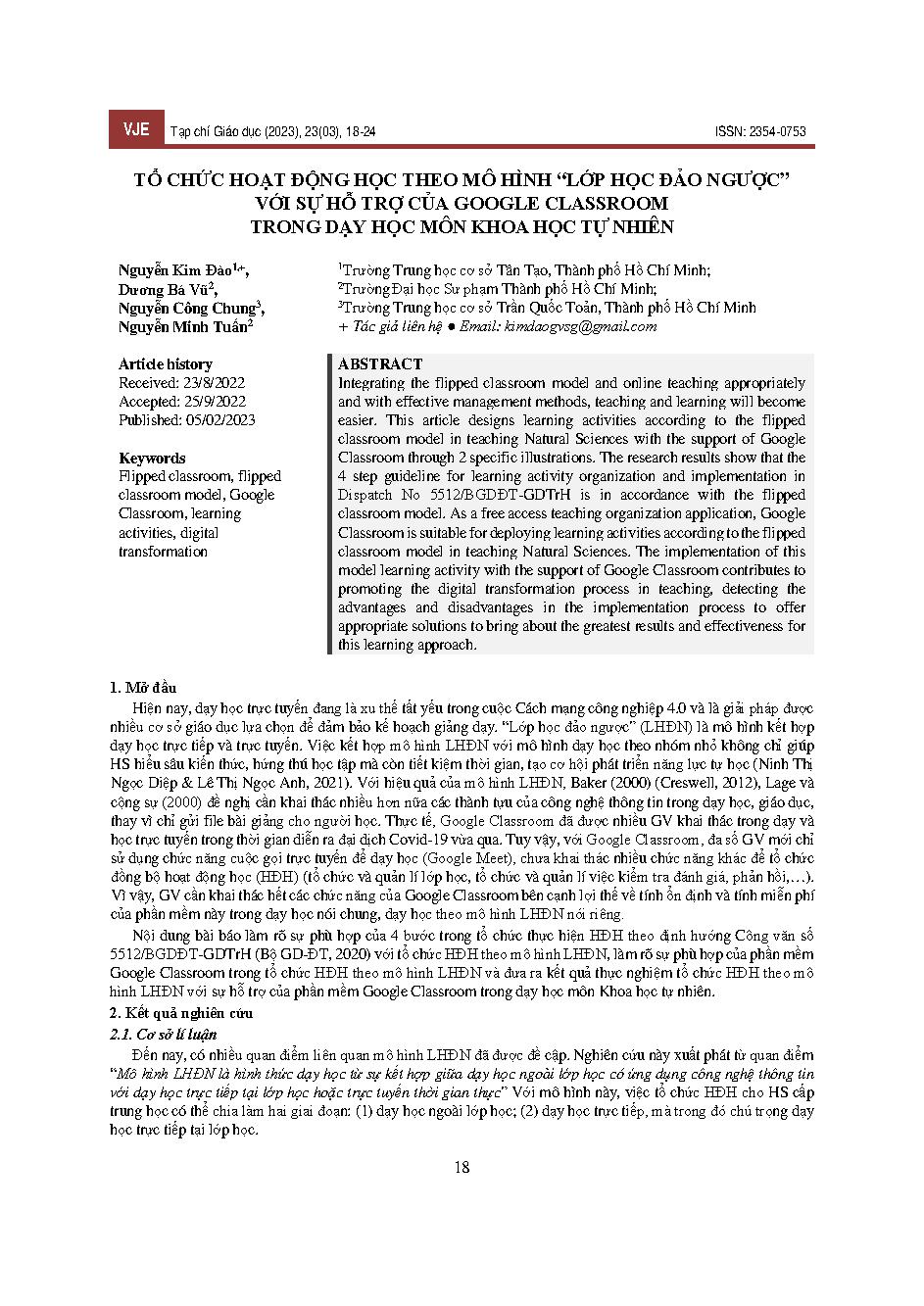 Tổ chức hoạt động học theo mô hình "lớp học đảo ngược" với sự hỗ trợ của google classroom trong dạy học môn khoa học tự nhiên = Organize learning activities according to the model of "reversed classroom" with the support of google classroom in teaching na