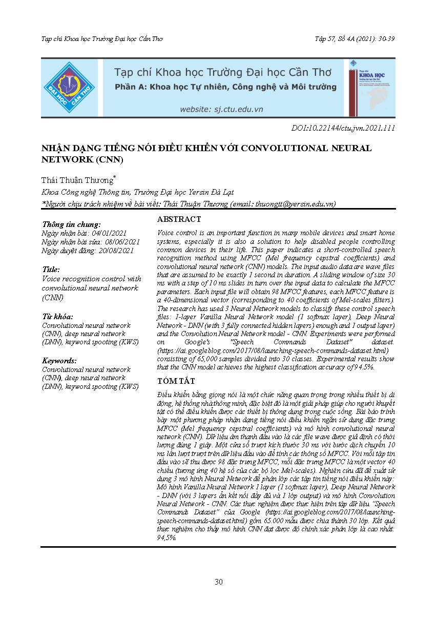 Nhận dạng tiếng nói điều khiển với convolutional neural network (CNN) = Voice recognition control with convolutional neural network (CNN)