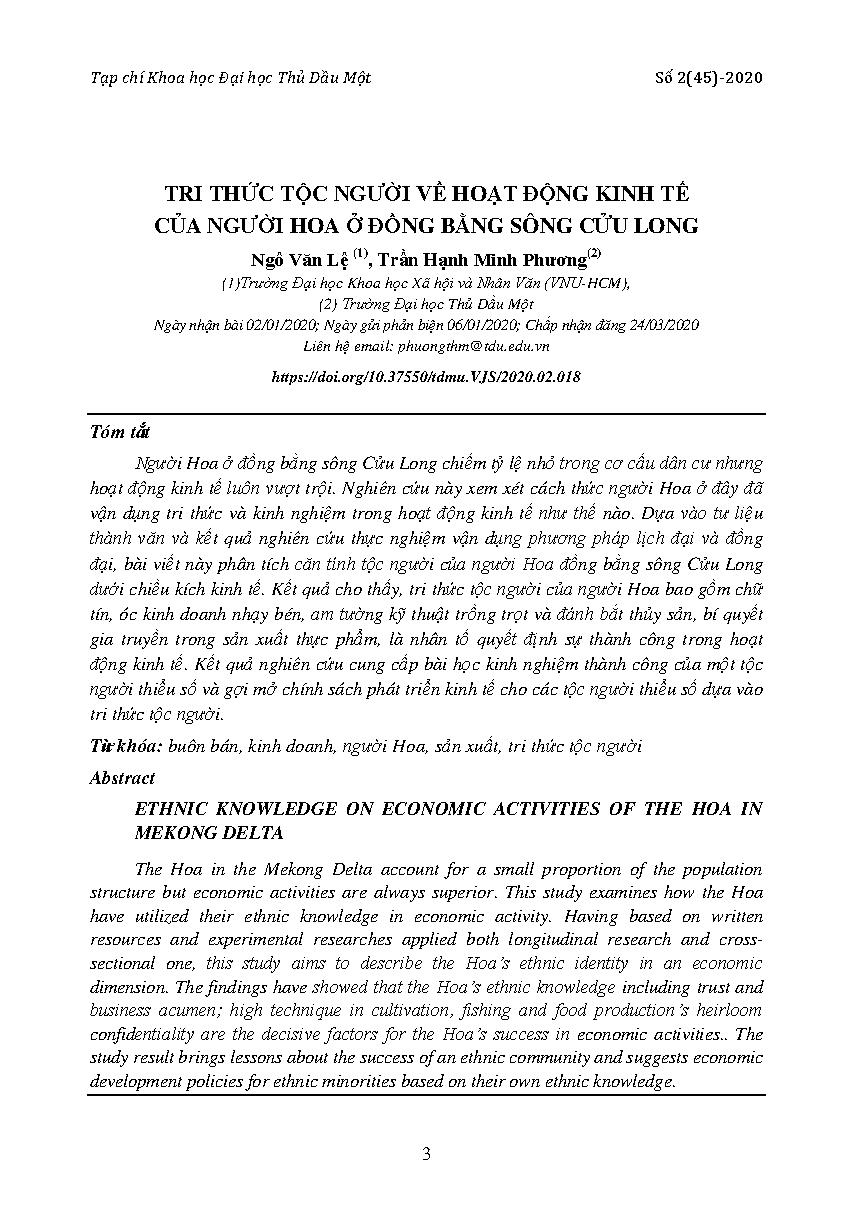 Tri thức tộc người về hoạt động kinh tế của người Hoa ở đồng bằng sông Cửu Long = Ethnic knowledge on economic activities of the Hoa in Mekong delta