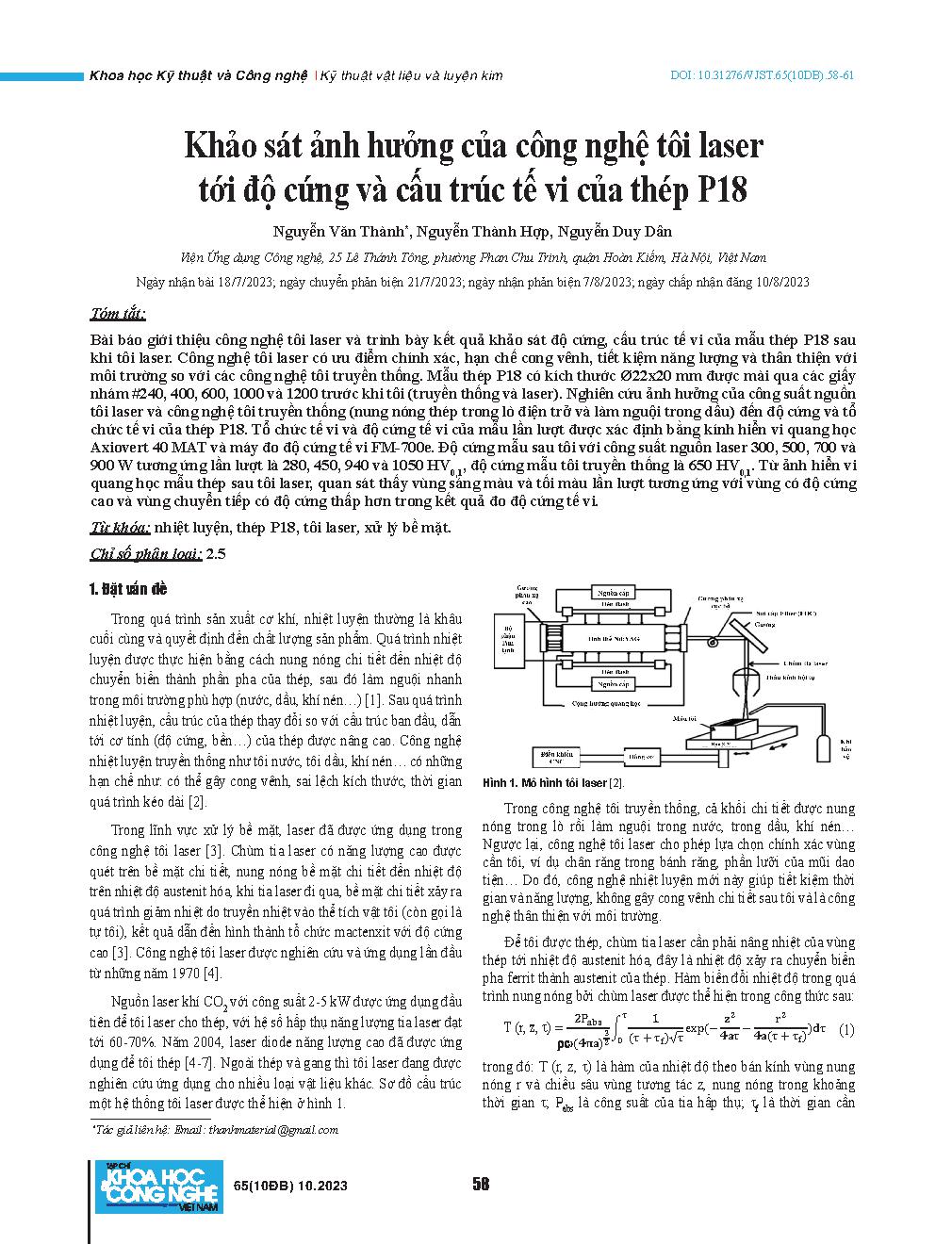 Khảo sát ảnh hưởng của công nghệ tôi laser tới độ cứng và cấu trúc tế vi của thép P18 = Investigating the effects of the laser quenching technology on the hardness and microstructure of P18 steel