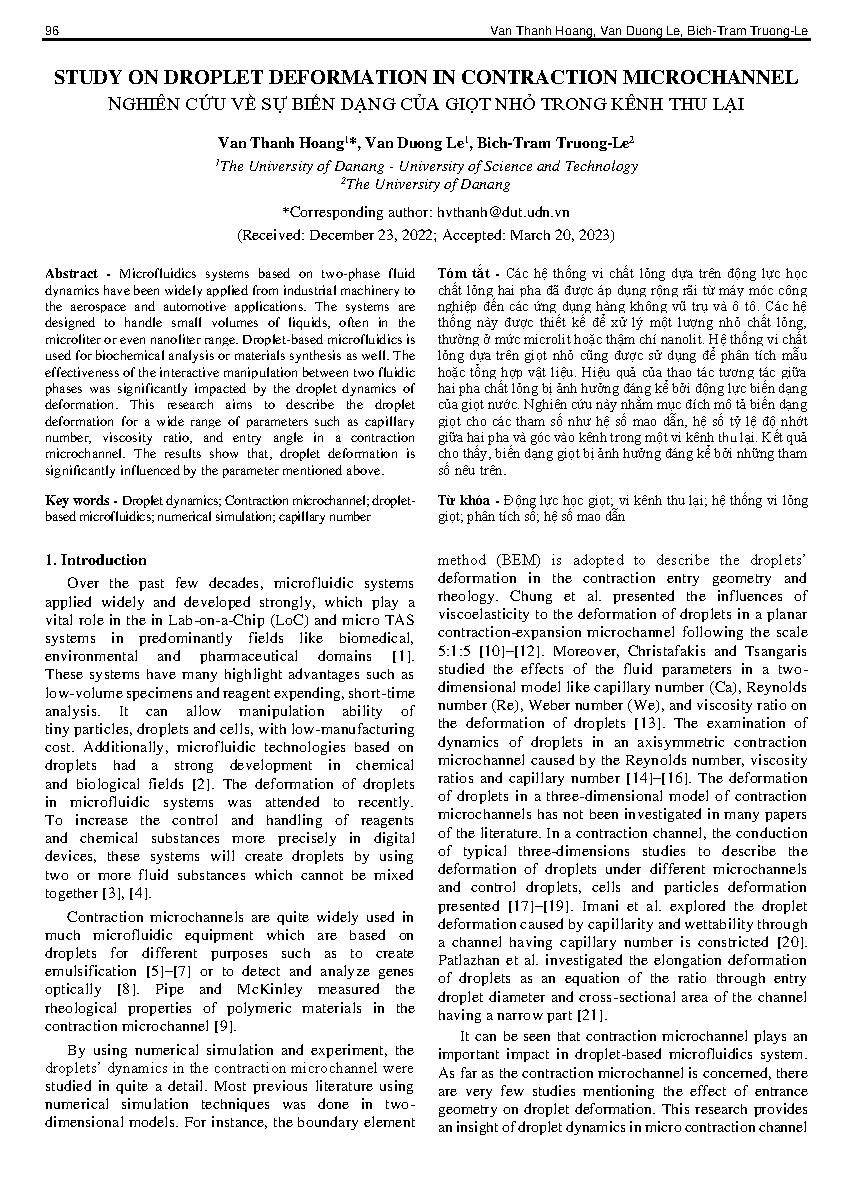 Nghiên cứu về sự biến dạng của giọt nhỏ trong kênh thu lại = Study on droplet deformation in contraction microchannel