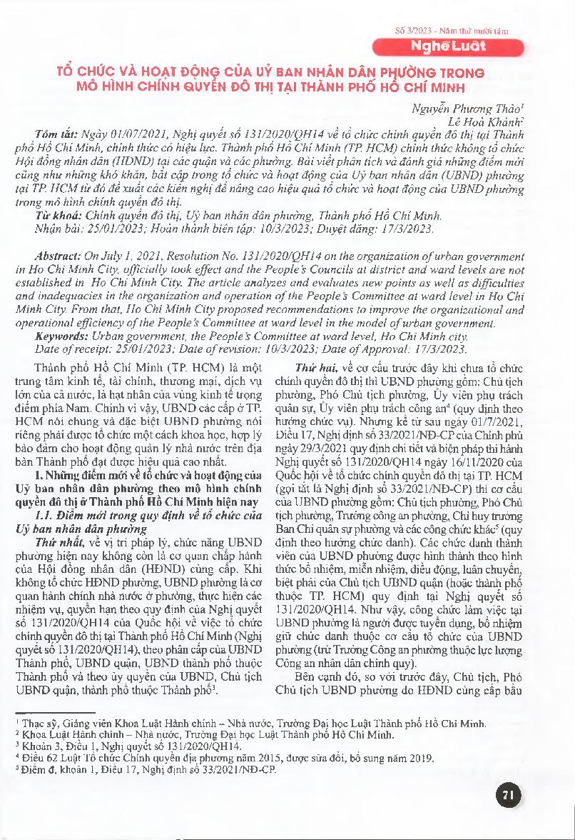 Tổ chức và hoạt động của ủy ban nhân dân phường trong mô hình chính quyền đô thị tại Thành phố Hồ Chí Minh = Organization and operation of the ward People's Committee in the urban government model in Ho Chi Minh City