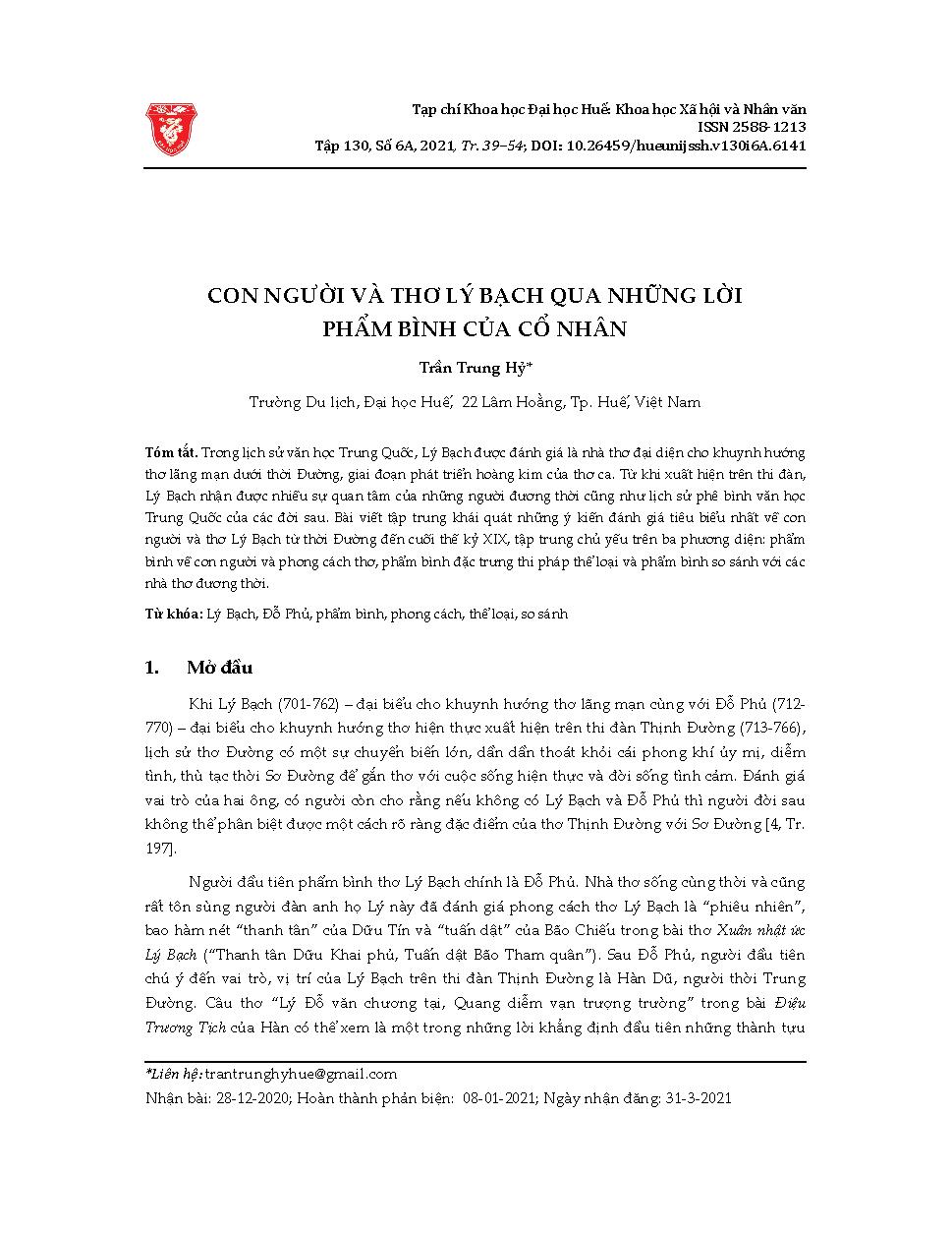 Con người và thơ Lý Bạch qua những lời phẩm bình của cổ nhân = Li Bai’s self and poetry through ancient criticisms