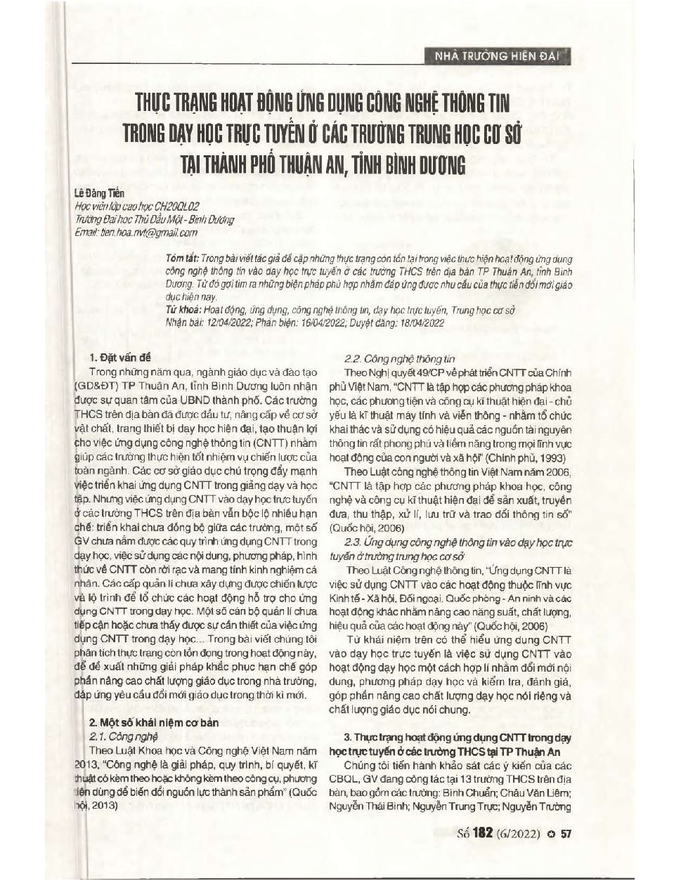Thực trạng hoạt động ứng dụng công nghệ thông tin trong dạy học trực tuyến ở các trường trung học cơ sở tại thành phố Thuận An, tỉnh Bình Dương = Reality of applying information technology in online teaching in junior high schools in Thuan An city, Binh D
