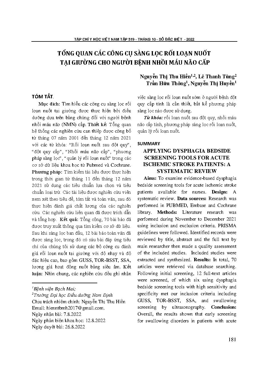 Tổng quan các công cụ sàng lọc rối loạn nuốt tại giường cho người bệnh nhồi máu não cấp = Applying dysphagia bedside screening tools for acute ischemic stroke patients: A systematic review