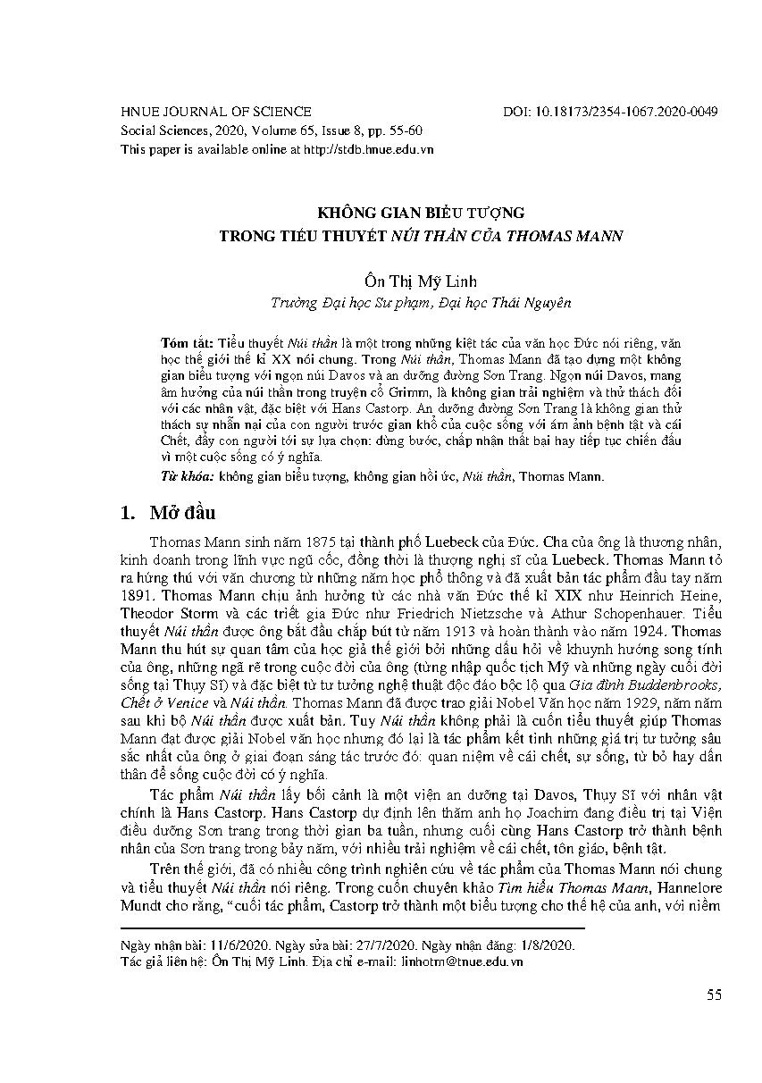 Không gian biểu tượng trong tiểu thuyết Núi thần của Thomas Mann = Symbolic space in The Magic Mountain of Thomas Mann