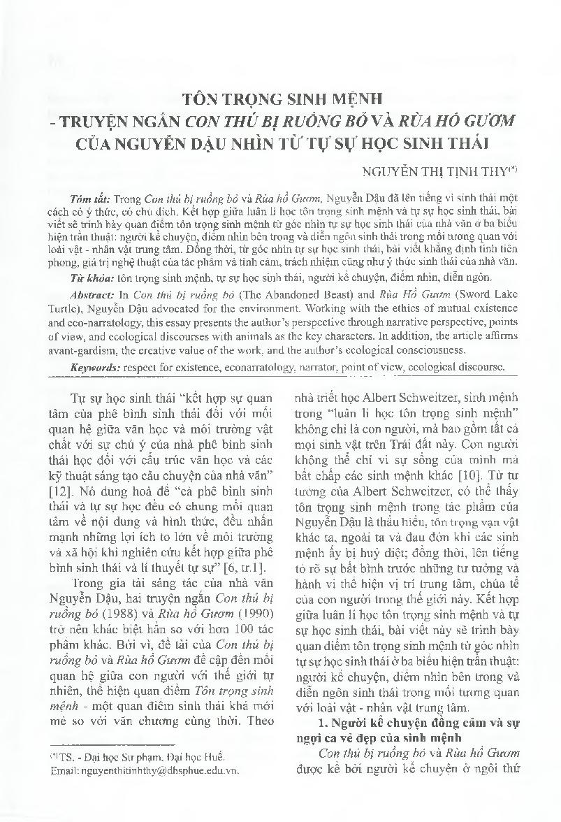 Tôn trọng sinh mệnh - truyện ngắn Con thú bị ruồng bỏ và Rùa hồ Gươm của Nguyễn Dậu nhìn từ tự sự học sinh thái = Respect for the existence: The short stories abandoned beast (Con thú bị ruồng bỏ) and Sword Lake Turtle (Rùa hồ Gươm) by Nguyễn Dậu from per