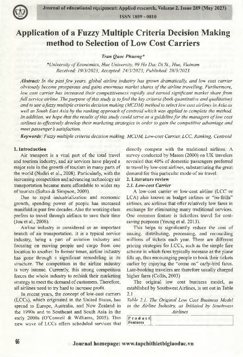 Ứng dụng phương pháp ra quyết định đa tiêu chí mờ để lựa chọn hãng vận chuyển chi phí thấp Đắc Di, Huế, Việt Nam = Application of a Fuzzy Multiple Criteria Decision Making method to Selection of Low Cost Carriers