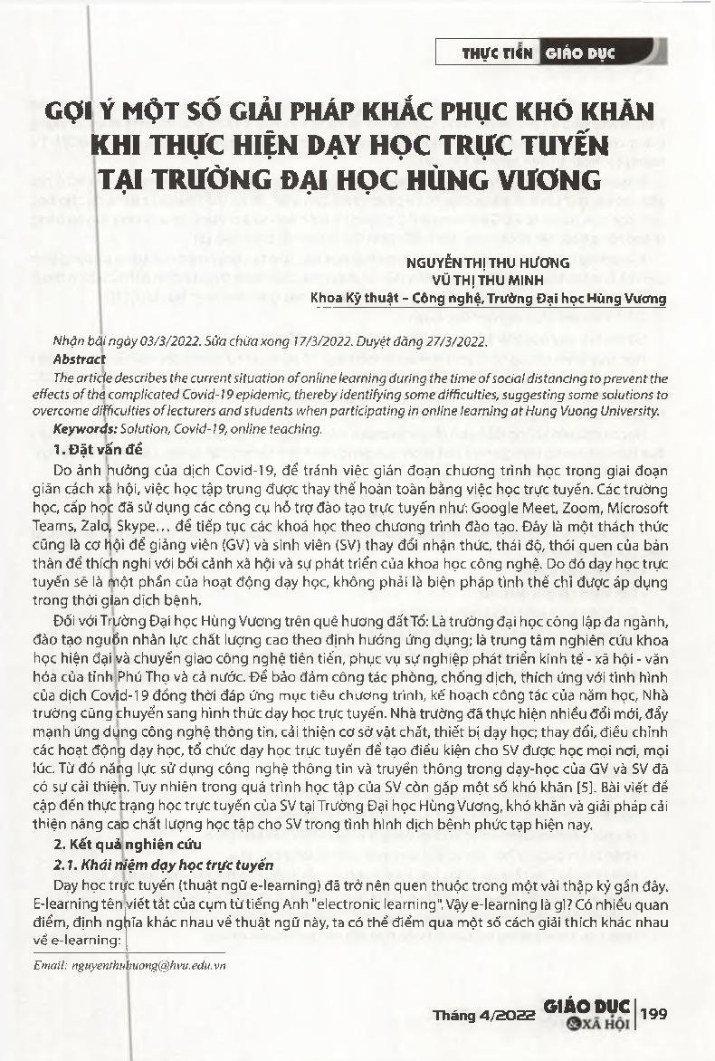 Gợi ý một số giải pháp khắc phục khó khăn khi thực hiện dạy học trực tuyến tại Trường Đại học Hùng Vương = Some solutions to overcome difficulties when implementing online learning at Hung Vuong University.