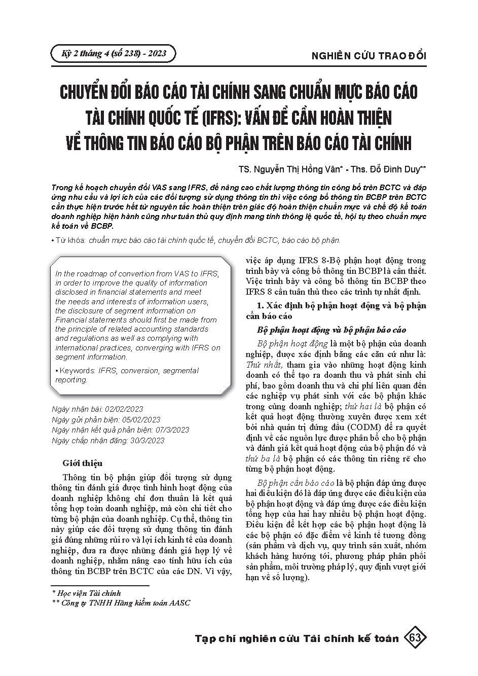 Chuyển đổi báo cáo tài chính sang chuẩn mực báo cáo tài chính quốc tế (IFRS): Vấn đề cần hoàn thiện về thông tin báo cáo bộ phận trên báo cáo tài chính = Converting financial statements to international financial reporting standards (IFRS): Issues to impr