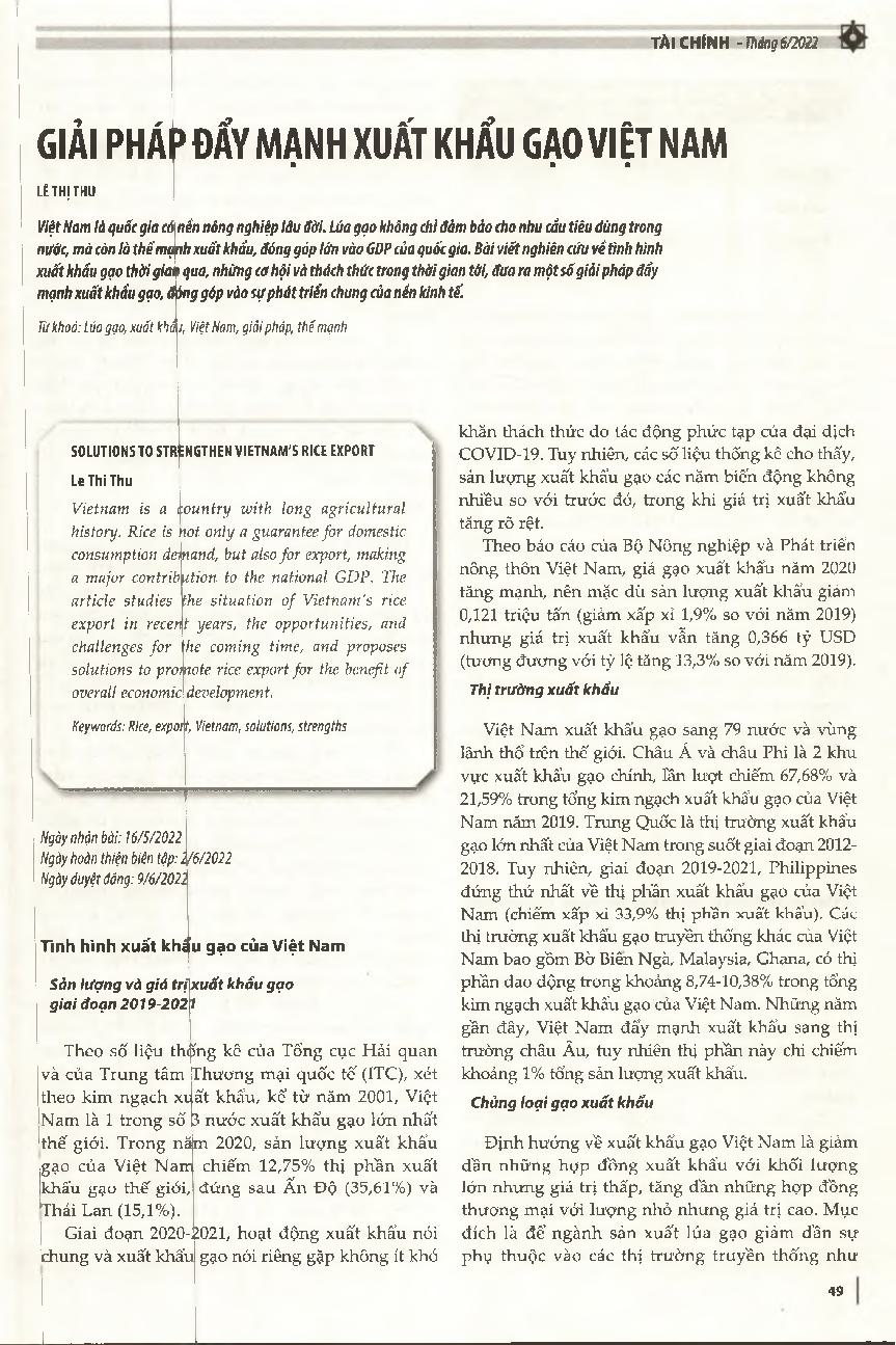 Giải pháp đẩy mạnh xuất khẩu gạo Việt Nam = Solutions to strengthen Vietnam&; 39;s rice export