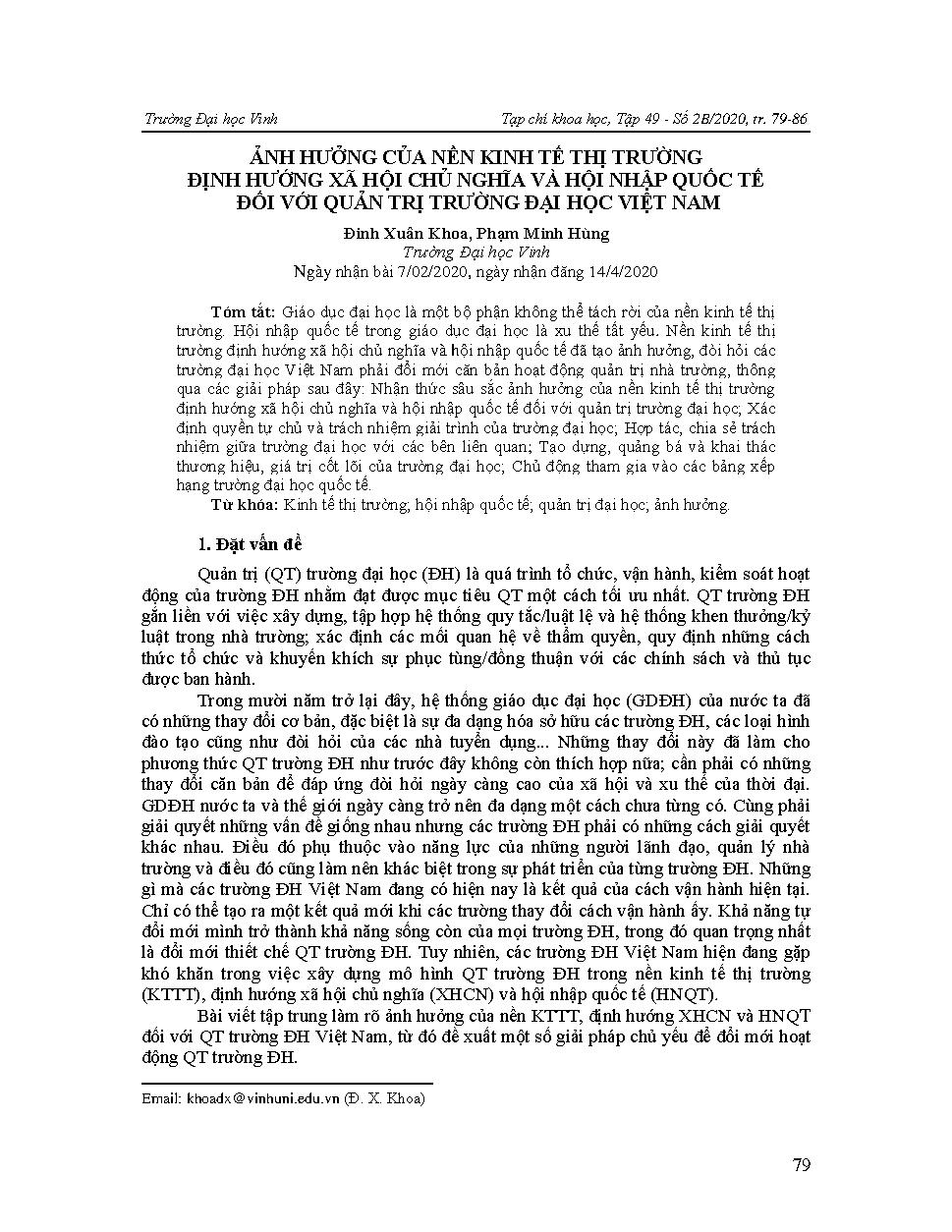 Ảnh hưởng của nền kinh tế thị trường định hướng xã hội chủ nghĩa và hội nhập quốc tế đối với quản trị trường đại học Việt Nam = Impacts of the socialist-oriented market economy and international integration on university governance in Vietnam