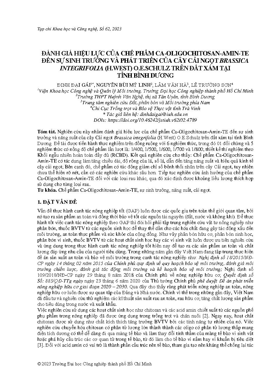 Đánh giá hiệu lực của chế phẩm Ca-Oligochitosan-amin-TE đến sự sinh trưởng và phát triển của cây cải ngọt Brassica integrifolia (H.West) O.E.Schulz trên đất xám tại tỉnh Bình Dương = Assessment the impact of ca-oligochitosan-amin-te produced products on t