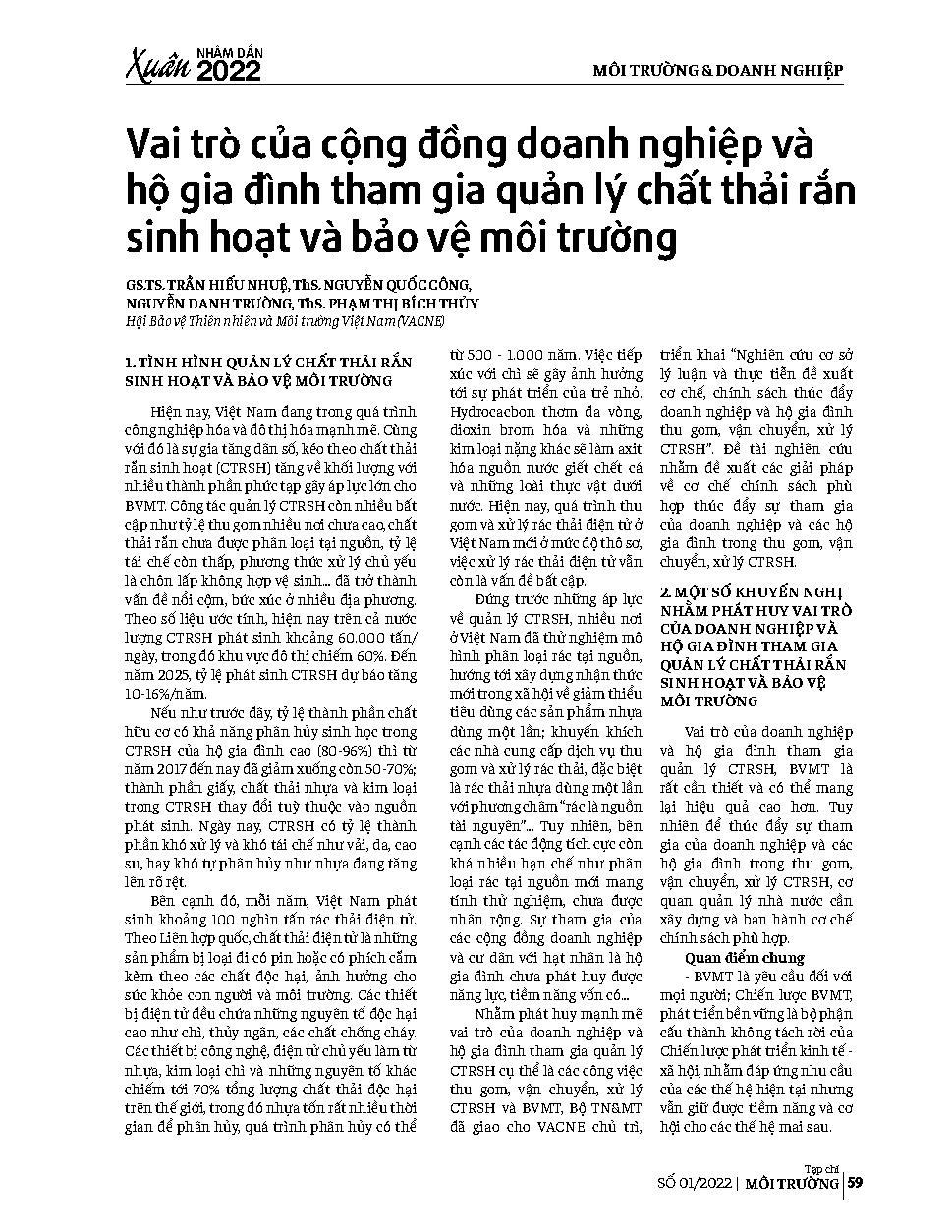 Vai trò của cộng đồng doanh nghiệp và hộ gia đình tham gia quản lý chất thải rắn sinh hoạt và bảo vệ môi trường