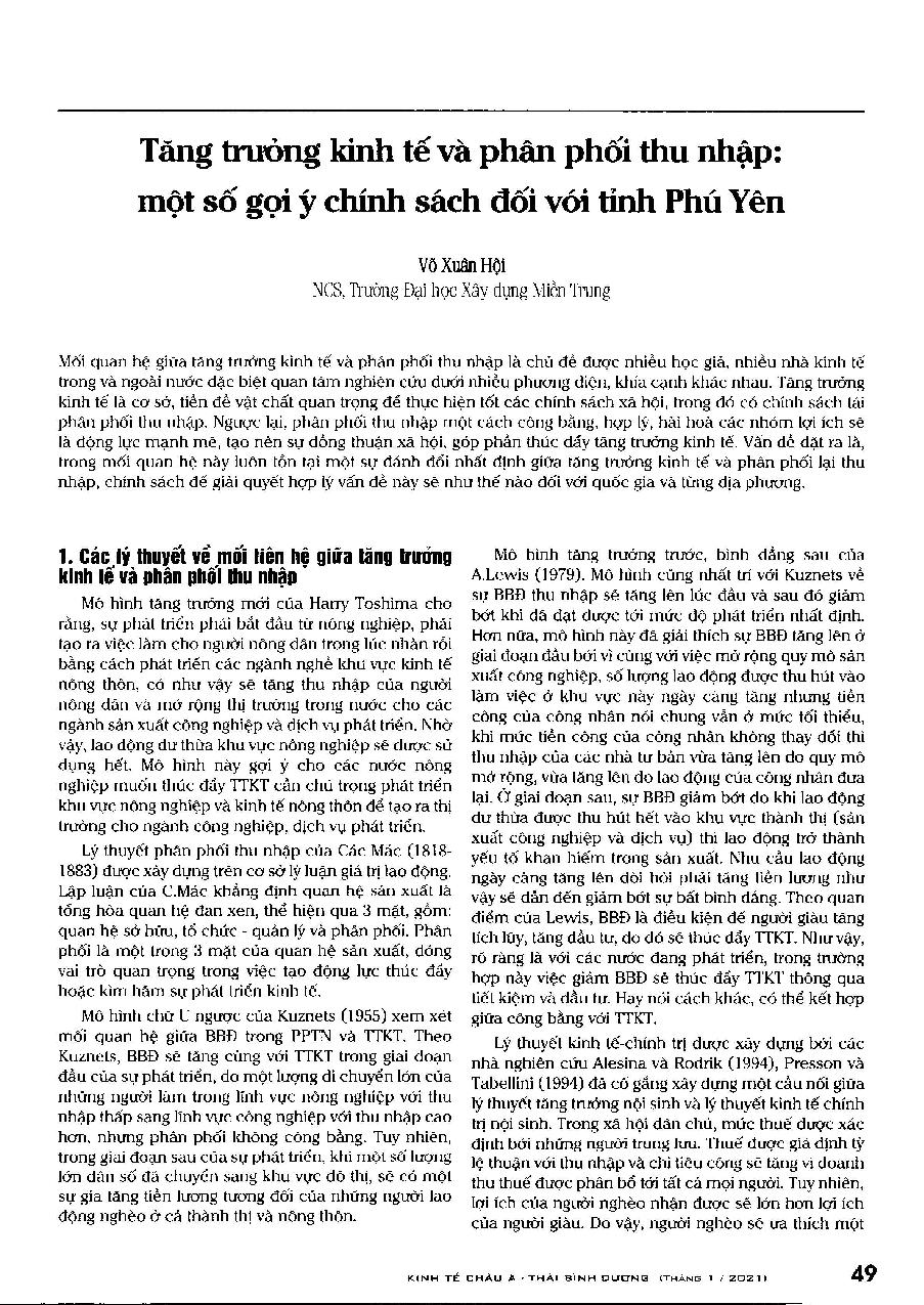 Tăng trưởng kinh tế và phân phối thu nhập: một số gợi ý chính sách đối vói tỉnh Phú Yên