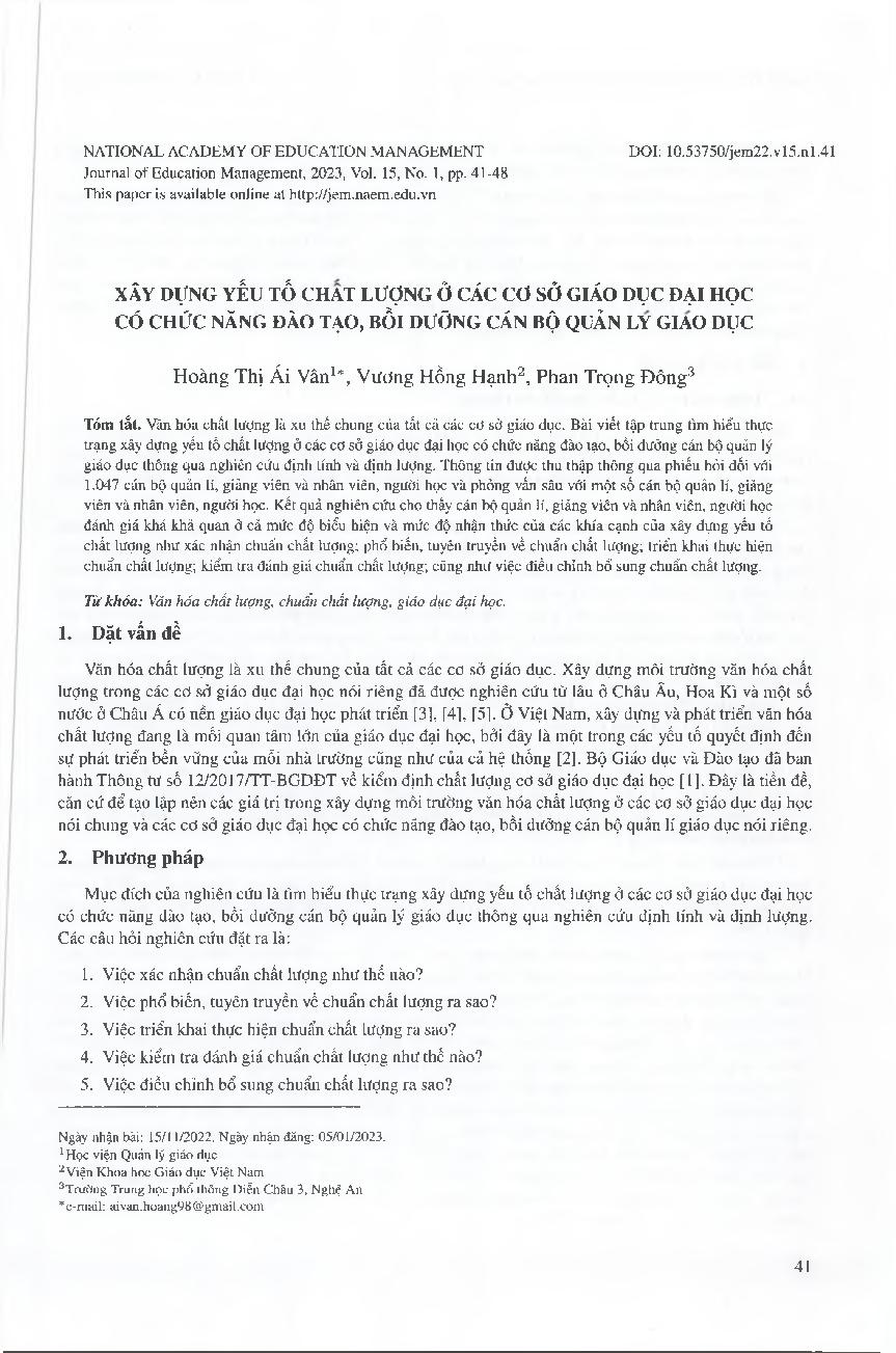 Xây dựng yếu tố chất lượng ở các cơ sở giáo dục đại học có chức năng đào tạo, bồi dưỡng cán bộ quản lý giáo dục = Building quality factors in higher education institutions with functions in education and training of education managers