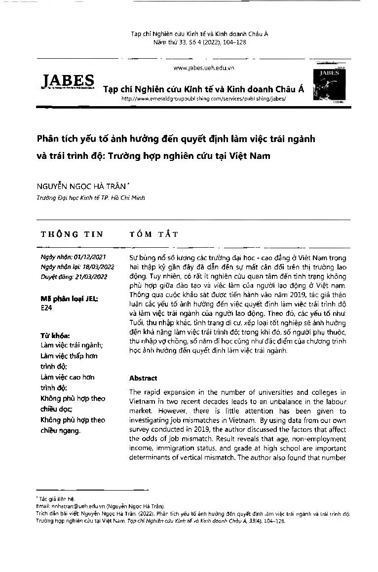 Phân tích yếu tố ảnh hưởng đến quyết định làm việc trái ngành và trái trình độ: Trường hợp nghiên cứu tại Việt Nam = Analysis of factors affecting the decision to work in the field and unqualified: A case study in Vietnam
